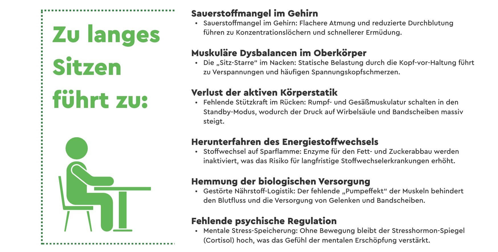 Unser Körper ist evolutionär auf Bewegung ausgelegt. Wenn wir jedoch acht bis zehn Stunden täglich sitzen, passieren im Körper Prozesse, die langfristig die Gesundheit beeinträchtigen. Die Muskulatur erschlafft, der Stoffwechsel fährt auf ein Minimum herunter und die Durchblutung stockt. Besonders kritisch ist hierbei, dass selbst intensiver Sport nach Feierabend die negativen Effekte eines komplett sitzend verbrachten Tages oft nicht vollständig kompensieren kann.
